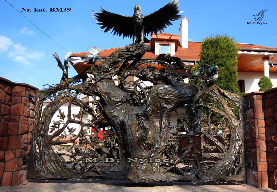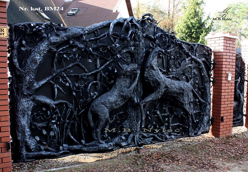 Proponujemy Państwu produkowane w naszej firmie, jedyne w swoim rodzaju kowalskie bramy wjazdowe. Bramy takie budujemy na kształt metalowych rzeźb nadając im pełną plastyczność. Bramy takie wyglądem różnią się diametralnie od jakichkolwiek innych bram. Pomysł na stworzenie takich bram zrodził się w naszej firmie i został zrealizowanym dzięki ogromnemu, kilkudziesięcioletniemu doświadczeniu naszych najlepszych metaloplastyków i kowali. Bramy kute w kształcie rzeźb stalowych najczęściej wykonujemy czerpiąc motywy z otaczającej nasz natury, wewnątrz scen stworzonych w bramach umieszczamy różnoraką roślinność , zwierzęta i inne figury stalowe. Nie istnieją dla naszej firmy jakiekolwiek fizyczne ograniczenia, wewnątrz takiej bramy możemy stworzyć każdą scenę o jakiej Państwo tylko pomyślą. Możemy wykonać dla Państwa kutą bramę która zawiera sceny na przykład walczących ze sobą wojowników z metalu lub jakikolwiek inny motyw, każda rzecz jest możliwa do zrobienia. Nasze rzeźby bramowe posiadają bardzo skomplikowaną budowę wewnętrzną i bardzo dużą masę - wymagają wymurowania solidnych słupów bramowych. Jesteśmy prawdopodobnie jedyną firmą na świecie w której mogą Państwo zrealizować projekt tego typu. Zapraszamy do naszej galerii wystawowej gdzie mogą oglądnąć Państwo takie bramy na żywo.